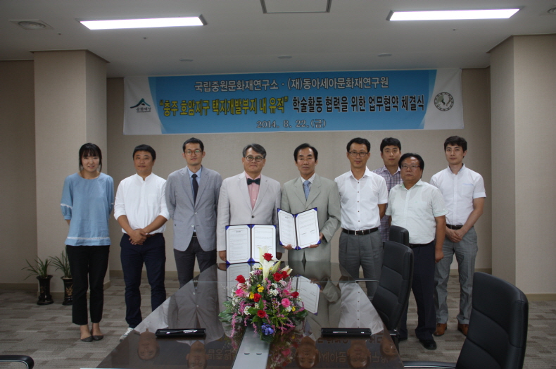 국립중원문화재연구소와 (재)동아세아문화재연구원은 2014년 8월 22일 금요일 ‘충주 호암지구 택지개발사업부지내 유적’과 관련한 제반 학술활동에 대하여 긴밀한 공동 협력관계를 이루고자 학술교류와 관련돤 업무협약을 체결하였습니다. 협약체결의 목적은 ‘충주 호암지구 택지개발사업부지 내 유적’과 관련한 제반 학술활동에 상호 협력함으로써 중원문화권 학술연구의 기반을 마련하고, 지역 문화유산의 가치 창출 및 활용에 기여하기 위해서입니다. 앞으로 상호 신뢰와 협력을 바탕으로 유적에 대한 공동연구, 학술세미나 개최, 유물의 전시 등이 활발하게 이루어질 것입니다. 우리 연구원에서 발굴조사하고 있는 유적의 가치를 높여줄 아주 좋은 계기를 마련한 것으로 높이 평가됩니다. |